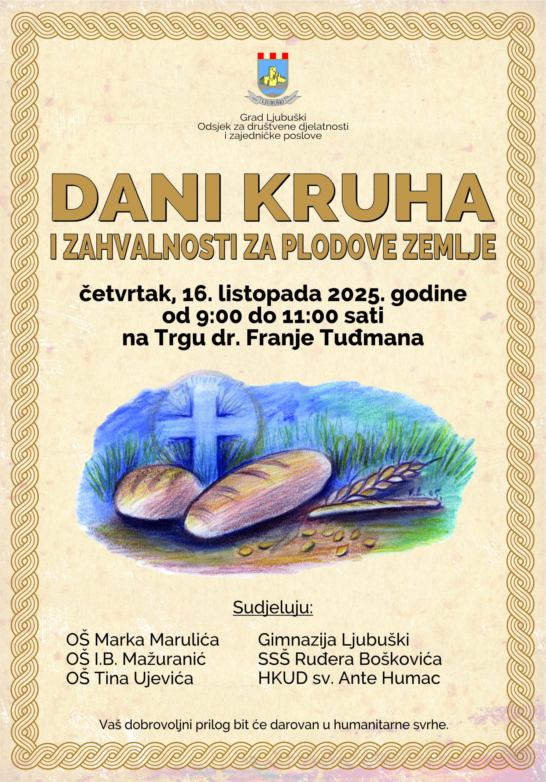 Grad Ljubuški po osamnaesti put organizira obilježavanje tradicionalne manifestacije «Dani kruha i zahvalnosti za plodove zemlje» koja će se održati u četvrtak 16. listopada 2025. godine od 9:00 do 11:00 sati na Trgu dr. Franje Tuđmana.